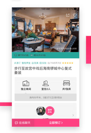 4、在线预约功能:在民宿APP上挑选到符合心意的房源后,选择入住时间进行预订。